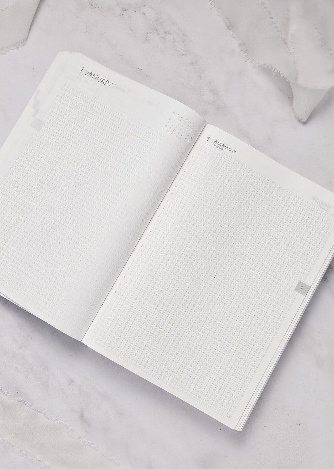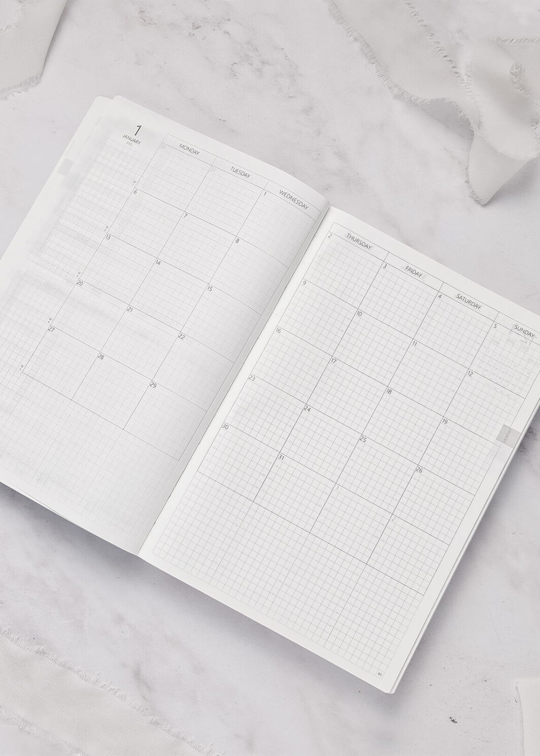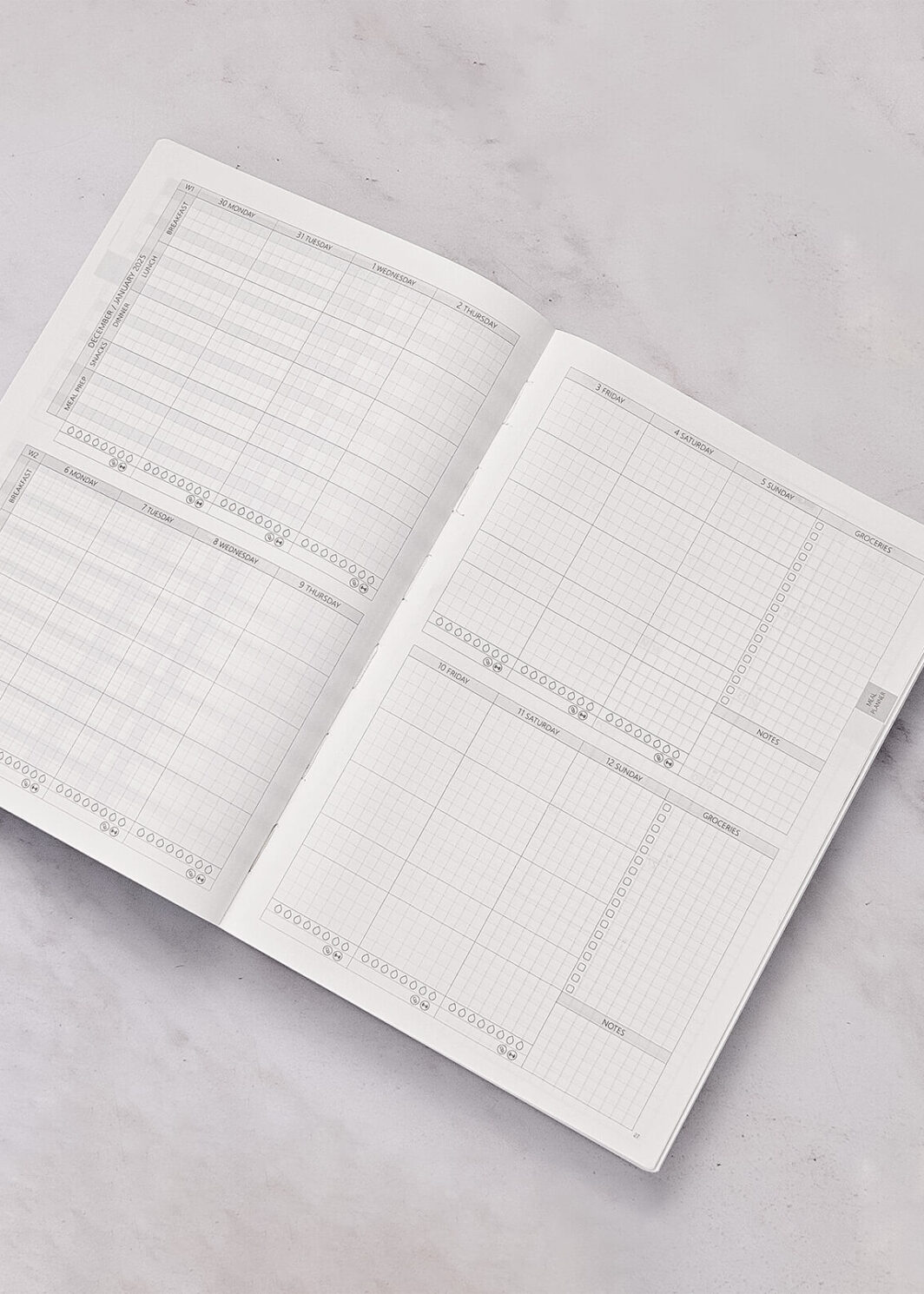 - Monthly Tab consists of 14 Monthly Overviews (two page spread per month) with a Monday Start including Week Numbers. (December 2024 – January 2026)