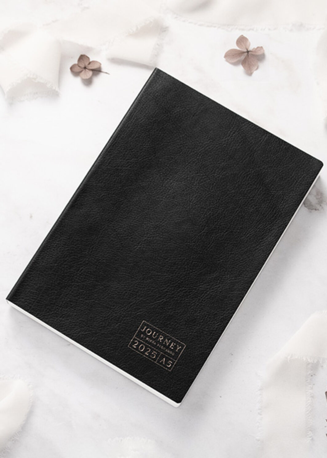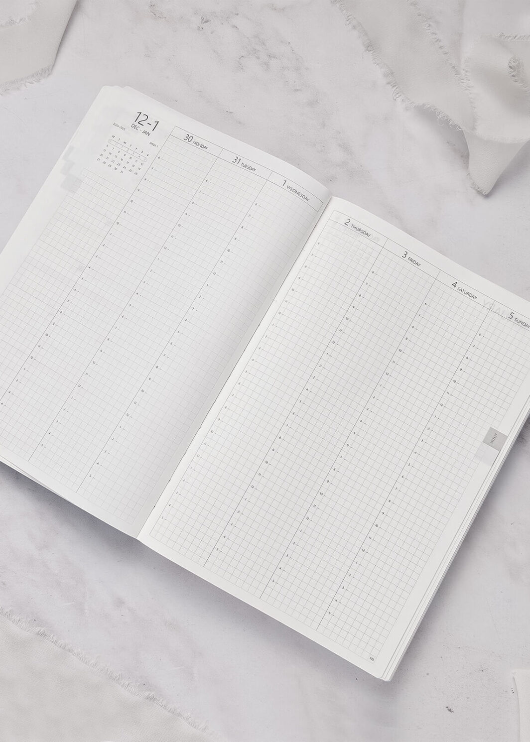 - Daily Tab consists of Month Starting with a Monthly Overview Page including a mini monthly Calendar Grid Page. Each Daily section consists of a timeline from 6am to 12 am for time blocking. Pages are marked with top/bottom, left/right center marks along with a center cross. (January 2025 – December 2025)