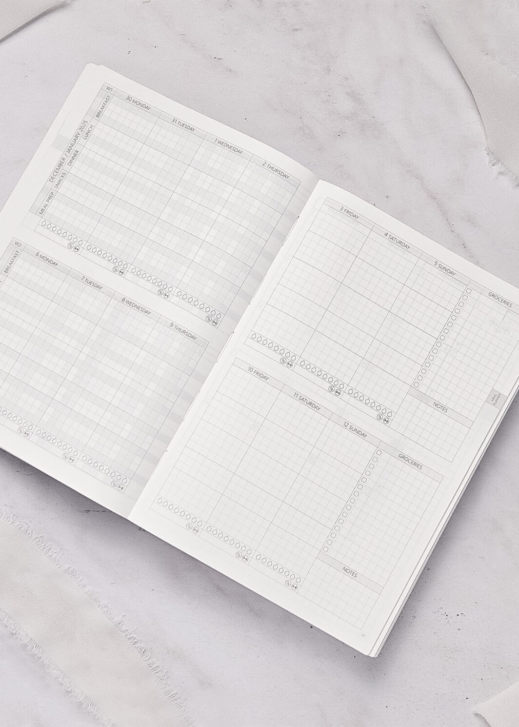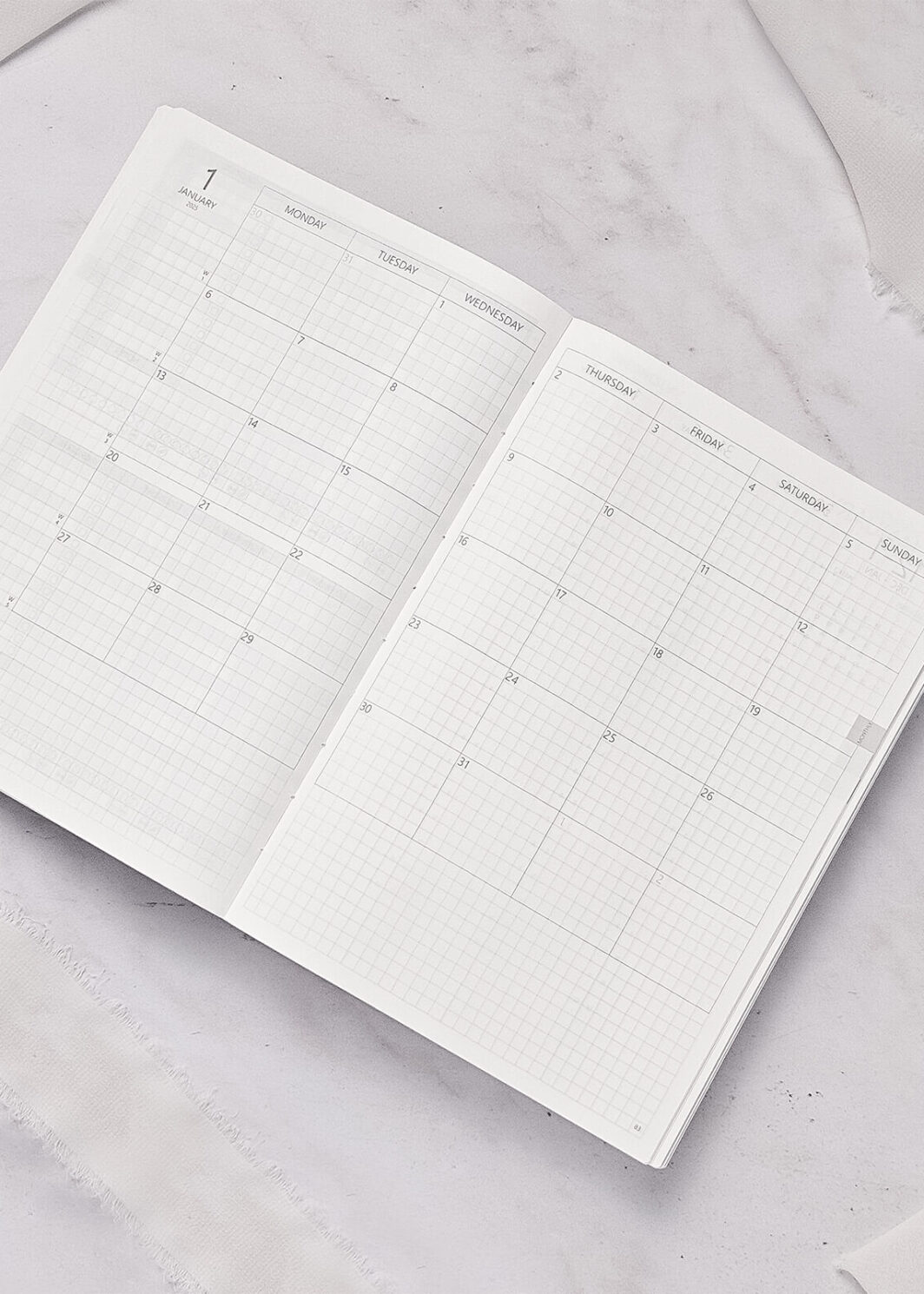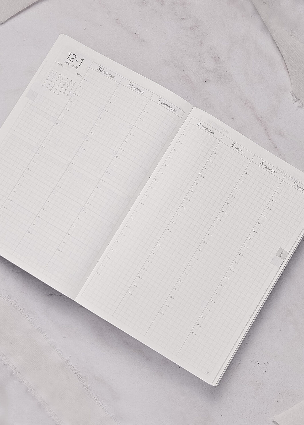 - Monthly Tab consists of 14 Monthly Overviews (two page spread per month) with a Monday Start including Week Numbers. (December 2024 – January 2026)