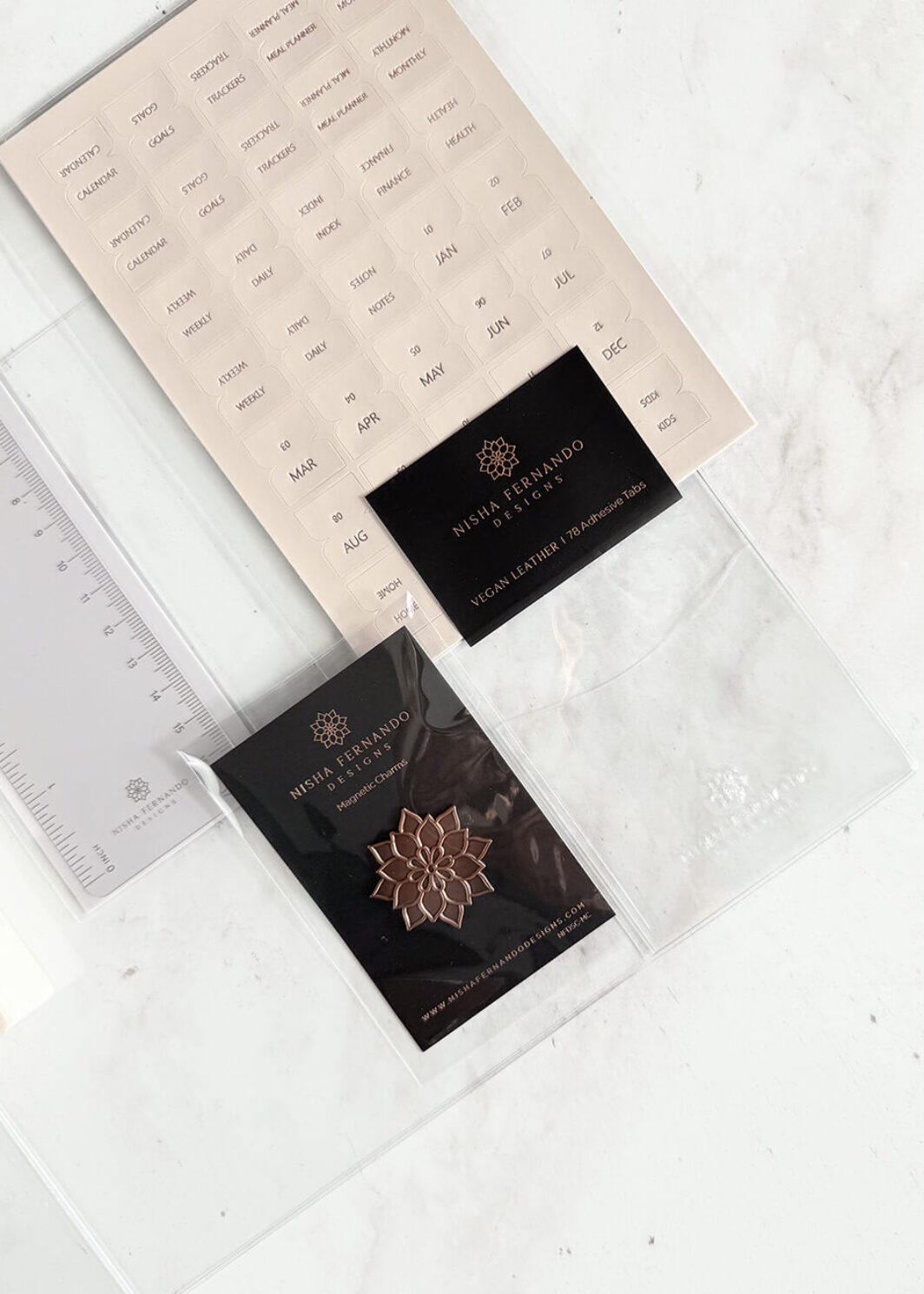 • Acrylic Ruler / Bookmark – Dual-purpose acrylic ruler and bookmark with Rose Gold accents. Lightweight and slim, and keeps your planner organized, with a “Today” indicator for easy reference.