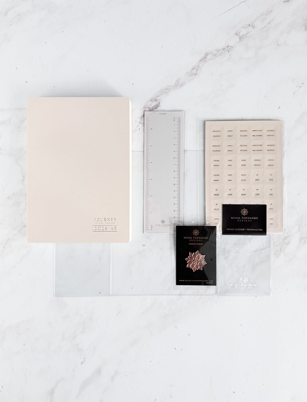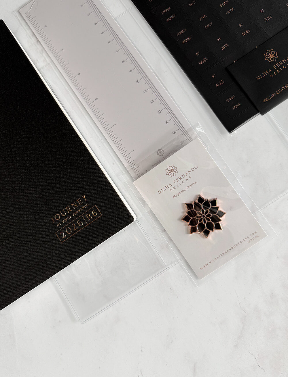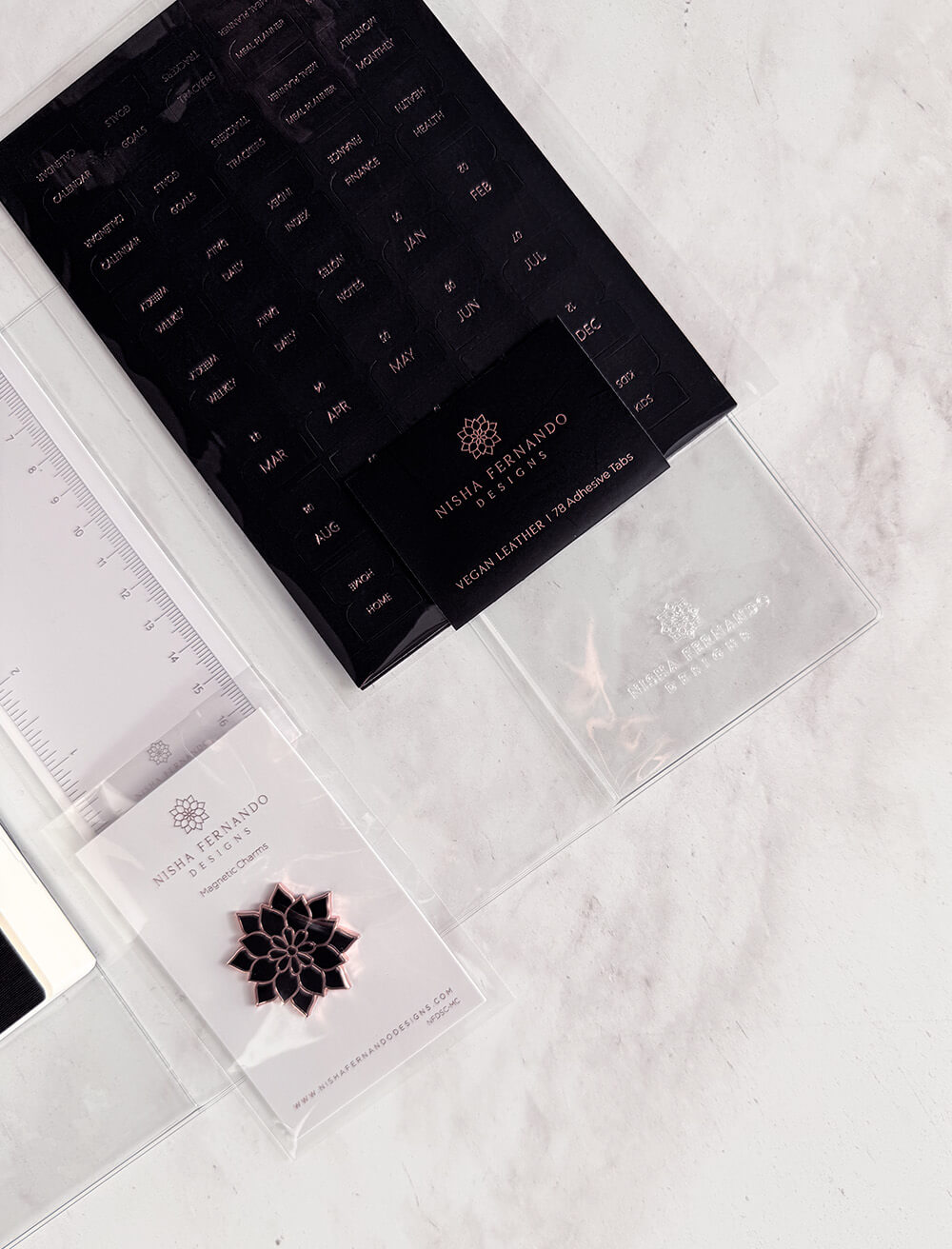 • Acrylic Ruler / Bookmark – Dual-purpose acrylic ruler and bookmark with Rose Gold accents. Lightweight and slim, and keeps your planner organized, with a “Today” indicator for easy reference.
