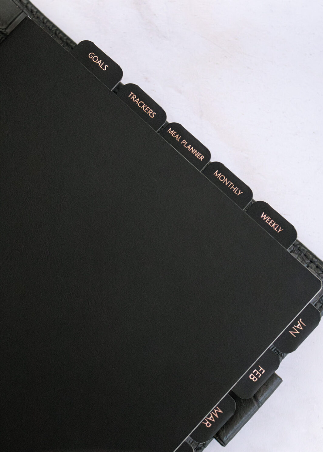 - Planner Organization Tabs: Calendar, Goals, Monthly, Weekly, Daily, Trackers, Meal Planner, Index, Notes.